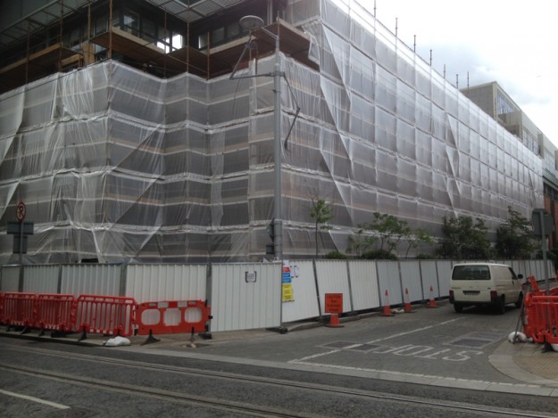 Client: John Paul Scaffolding: 13,000m2 Duration: 60 weeks External scaffold to full perimeter of Block A going 30 meters high, scaffold fully monorflex with canopy roof completed using heated shrink wrap system. Handrail each floors and scaffold to each lifts shaft for lift installation.